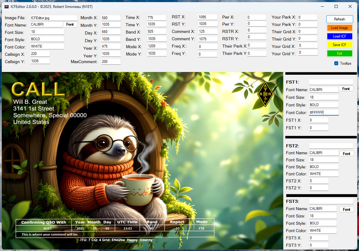 All cards utilized by QSOCaedCreator are accompanied by two components: a graphic (JPEG format, 1800x1200 pixels, 300 dpi) and an Image Configuration File (Text file with an ICF file extension). The ICF file contains the X (Horizontal) and Y (Vertical) coordinates for placing QSO data on the graphic, such as the date and mode. Additionally, the ICF file specifies the font, font style, font size, and font color to be used on the card. (Note: Color values can be entered as text (e.g., WHITE) or Hex values (e.g., #FFFFFF). The ICF file also includes three Free Style Text (FST1-FST3) fields for adding custom data. These fields have their own font characteristics. It is important to note that any item with a X value of zero will not be placed on the card. A tool is available (accessible here) that simplifies the creation and adjustment of the ICF file.